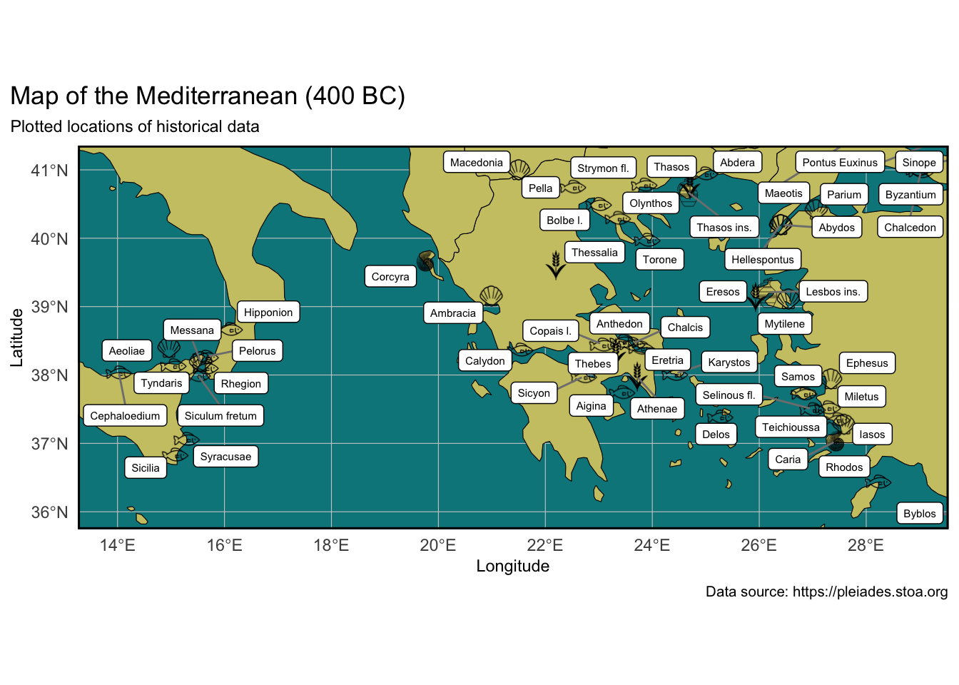 p_load(tidyverse, sf, rio, rnaturalearth, rnaturalearthdata, ggspatial)Point Map of the Ancient World, Made in R